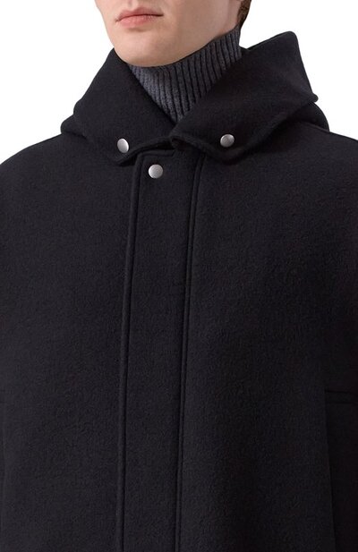 Oversize-пальто из линии Jil Sander+ выполнили из шерсти первого пострига. На талии предусмотрели внутреннюю кулиску, а по бокам – врезные карманы с широкими листочками. Роль декора отдали контрастной фирменной монограмме на левом рукаве. Модель с регулируемым капюшоном застегивается молнией, скрытой под штормовой планкой на кнопках.
