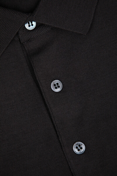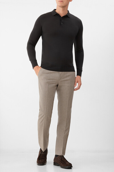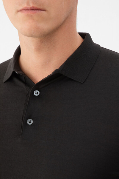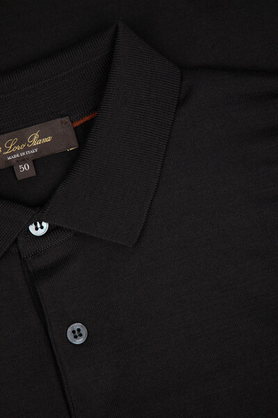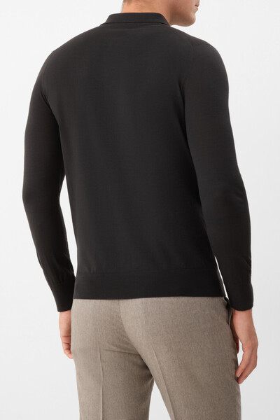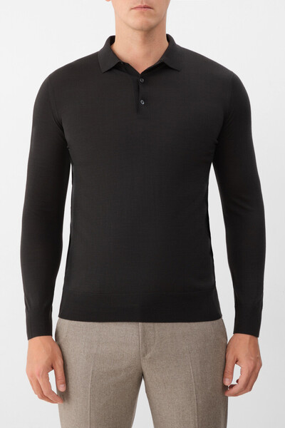 Прилегающее поло Loro Piana с длинными рукавами. Для производства модели на трёх пуговицах в верхней части выбрана чистая шерсть Wish® ониксового оттенка. Это материл высочайшего качества, получаемый у избранных овец породы меринос в Австралии и Новой Зеландии. Особенностями изделия являются вязка лицевой гладью и отсутствие броского декора, что делает поло ещё более универсальным.