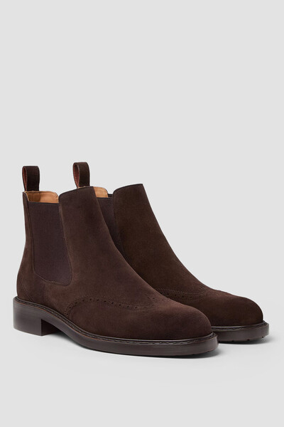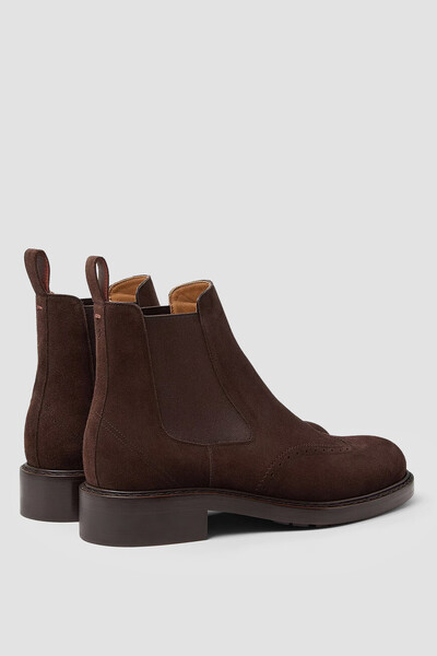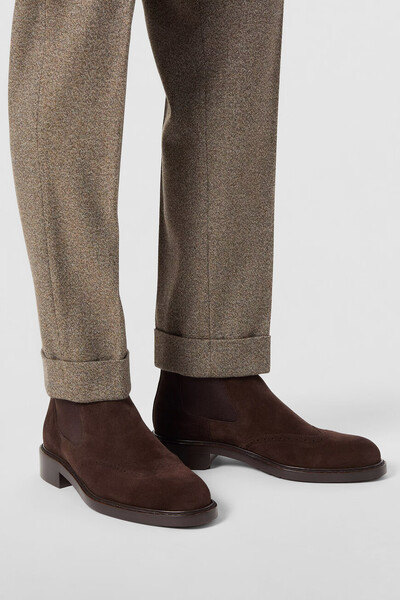 Замшевые челси Oliver Walk от бренда Loro Piana. Модель с эластичными вставками по бокам для удобства надевания выполнена в оттенке шоколад. Отделка-перфорация в стиле брог придаёт изделию уникальный характер. Пара с бархатистой текстурой обработана водоотталкивающим средством, увеличивающим функциональность. Ботинки без шнуровки можно легко надевать и снимать благодаря персонализированной ленте сзади.