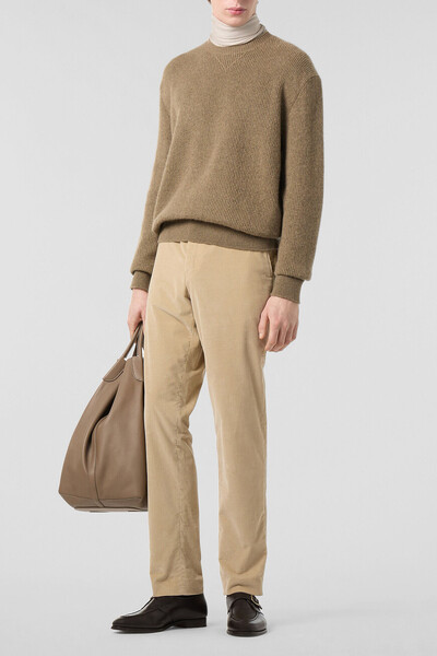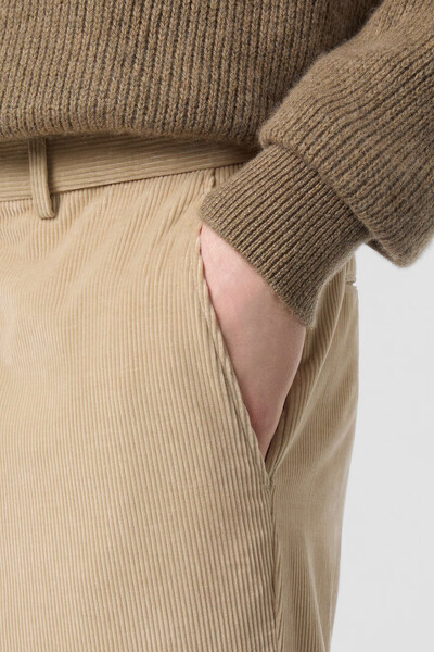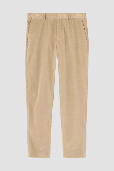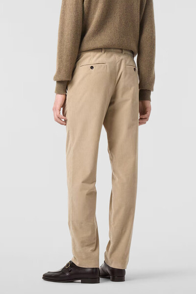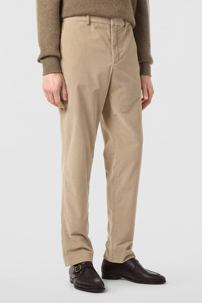 Хлопковые брюки Jarno от бренда Loro Piana на потайной молнии и крючке с планкой. Для пошива современной и в то же время базовой модели используется мягкой вельвет Hampton светло-бежевого оттенка с бархатистой текстурой. Конструкция изделия характеризуется слегка зауженными книзу бирючинами и средней посадкой по линии талии.