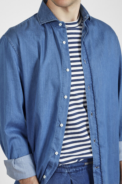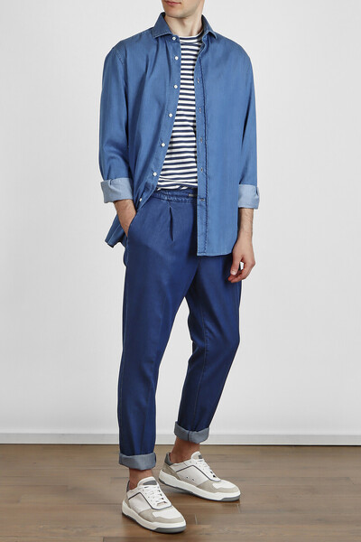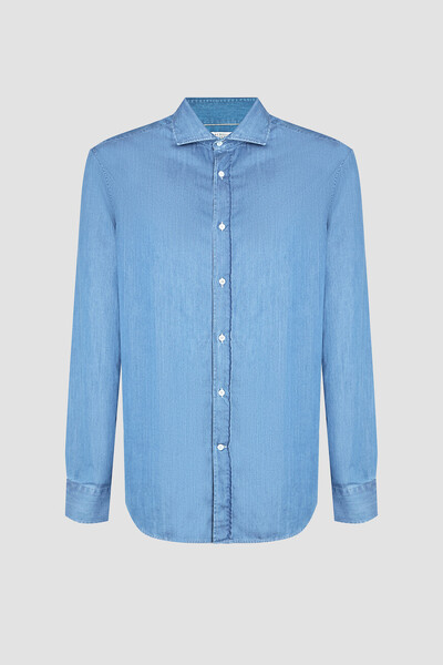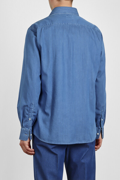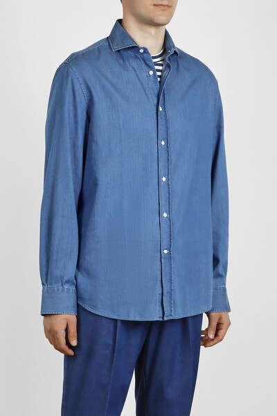 Джинсовая рубашка голубого оттенка от Brunello Cucinelli. Для производства повседневной модели с длинными рукавами используется мягкий хлопковый деним. Характерными особенностями изделия являются застёжка на перламутровые пуговицы с очерченной планкой и наличие закруглённого фигурного низа.