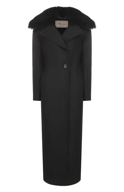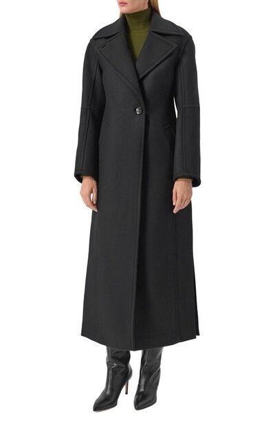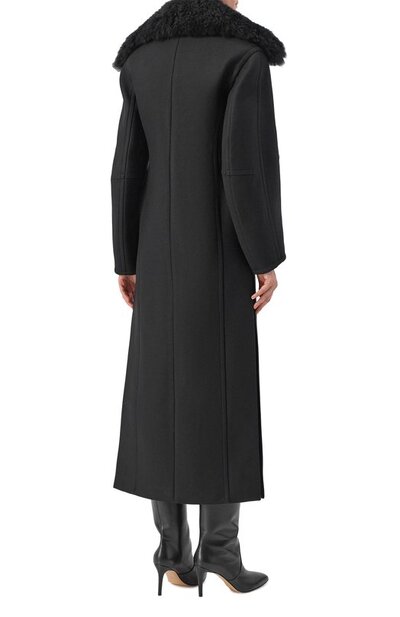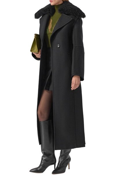 Для пошива однобортного пальто с широкими лацканами использовали смесь шерсти и полиамида. Модель с высокими боковыми разрезами и двумя карманами дополнили съемным воротником из овчины.