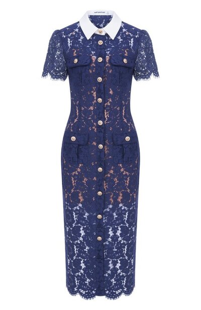 Миди-платье с контрастным воротником выполнили из цветочного кружева на основе нейлона с добавлением хлопка. Модель с акцентными пуговицами дополнили четырьмя карманами. В комплекте — короткое нижнее платье.
