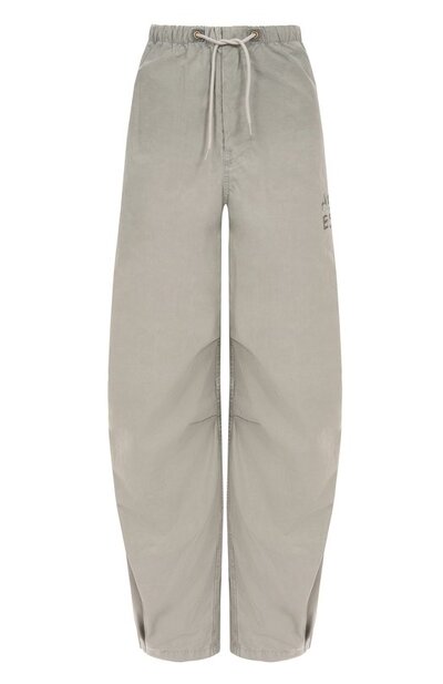 Брюки с регулируемым поясом-кулиской выполнили из жатого хлопка. Модель с двумя боковыми карманами и задним с клапаном дополнили складками в области колен и кнопками внизу. Изделие украсили фирменным принтом и вышитым логотипом.