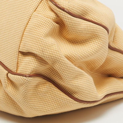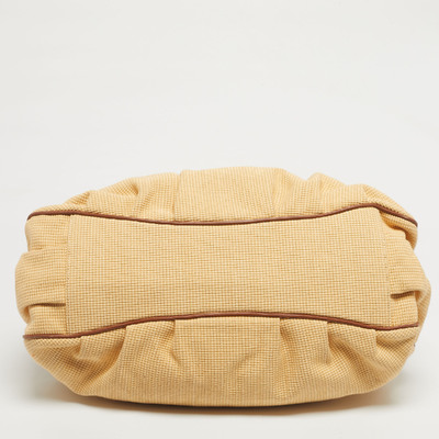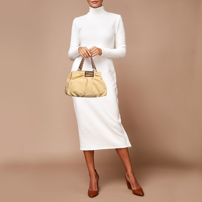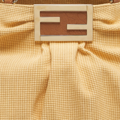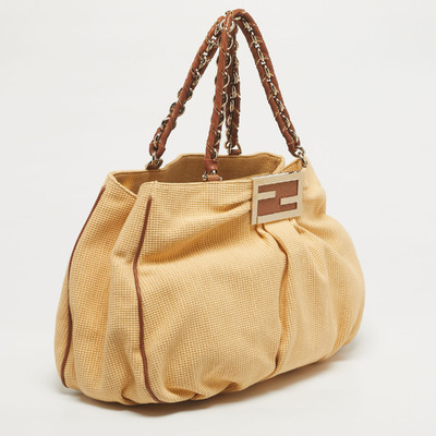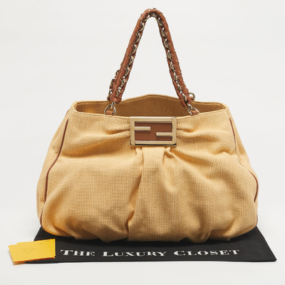 Braided raffia and soft brown leather intertwine, forming the Fendi Mia Shoulder Bag like a piece of wearable art. The gold tone “FF” logo anchors the design, while the chain and leather handle for easy grab, carrying confidence as naturally as it carries essentials.