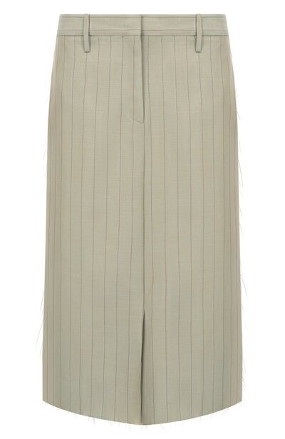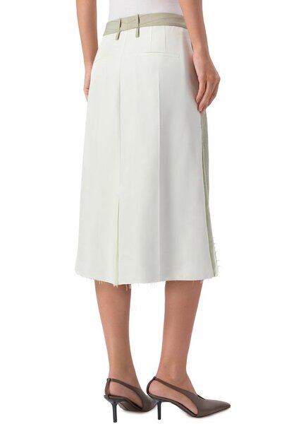 Для создания миди-юбки выбрали комбинацию полосатой шерсти и однотонной вискозы. Боковые швы и низ, как и края разрезов спереди и сзади, оставили необработанными. Модель с четырьмя карманами дополнили отутюженными стрелками.