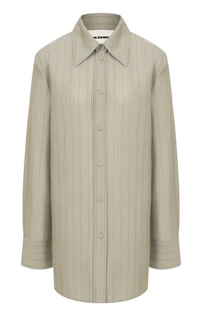 Полосатая рубашка гармонично впишется в образ с парной юбкой. Для пошива модели с обтяжными пуговицами использовали ткань из шерсти с добавлением мохера.