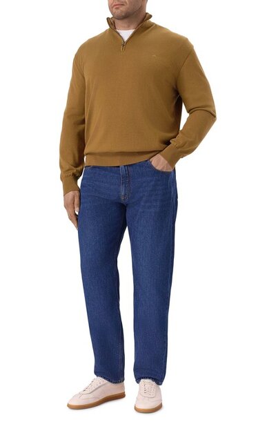 Джемпер с ребристыми манжетами, поясом и воротником-стойкой выполнили из трикотажа на основе лиоцелла и шерсти. Модель застегивается короткой молнией с эмблемой марки на пуллере.