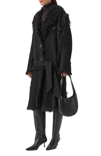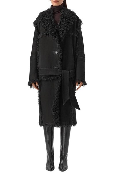Дубленку с двумя боковыми карманами, шлицей и широким поясом-лентой выполнили из овчины ягненка Ovis Aries Aries, выведя наружу швы. Модель застегивается брендированными пуговицами.