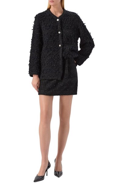 Мини-юбку выполнили из фактурного трикотажа на основе шерсти, мохера и вискозы. Прямую модель с защипами дополнили эластичным поясом.