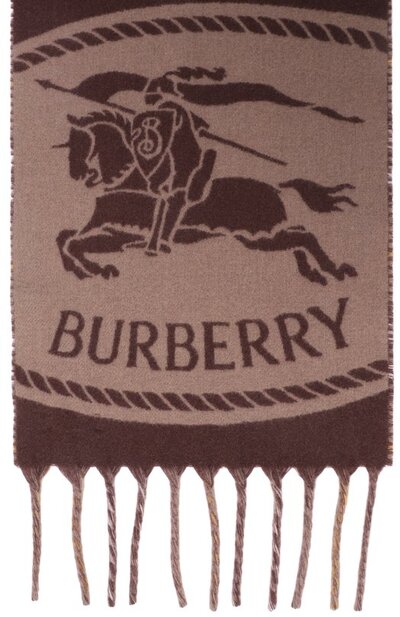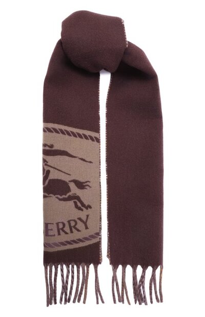 Для создания шарфа с длинной бахромой на концах выбрали ворсованный кашемир. Аксессуар с крупной эмблемой Knight stamp можно перевернуть стороной в клетку Burberry Check наружу.