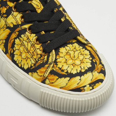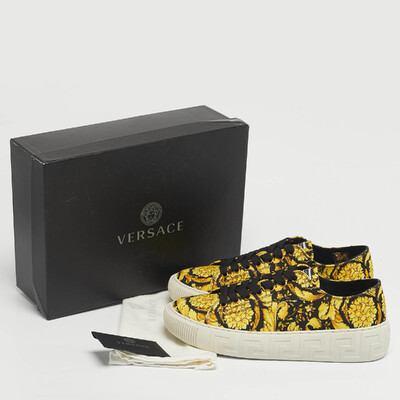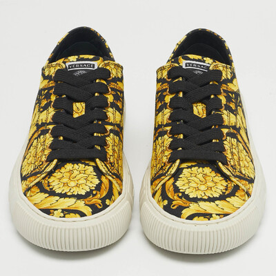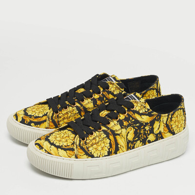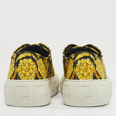 Versace’s Barocco print Greca sneakers merge yellow and black heritage canvas with a clean sole edged in the Greca pattern. This trainer shape wears its iconic motif openly while staying versatile. For shoppers seeking bold designer sneakers, these Versace Greca trainers deliver instant recognition.