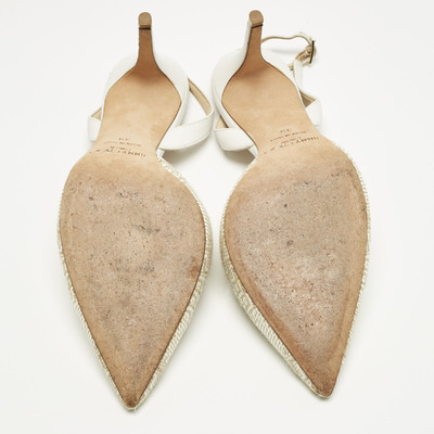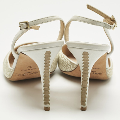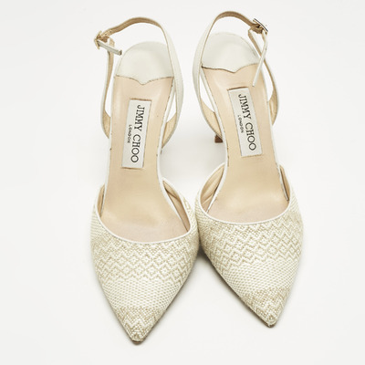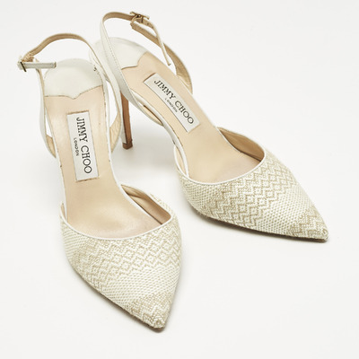 A modern twist on timeless femininity, these Jimmy Choo Tilly pumps feature a woven white and cream finish. With a pointed toe and slingback strap, they bring texture and elegance to warm weather styling.