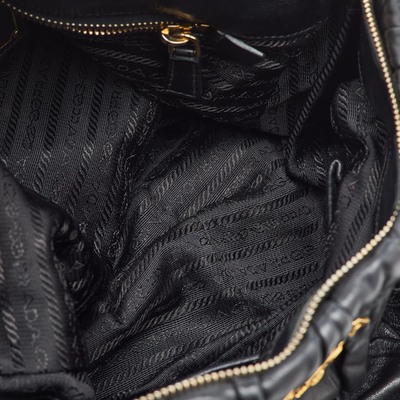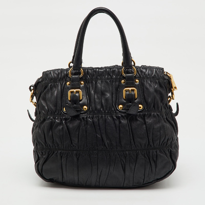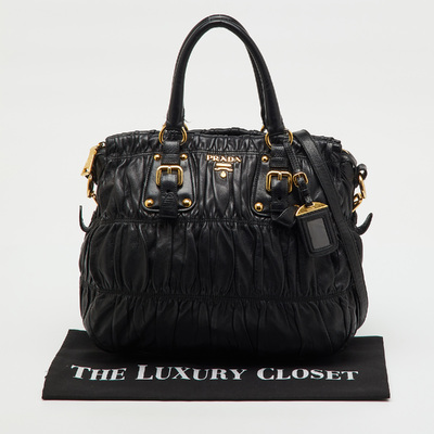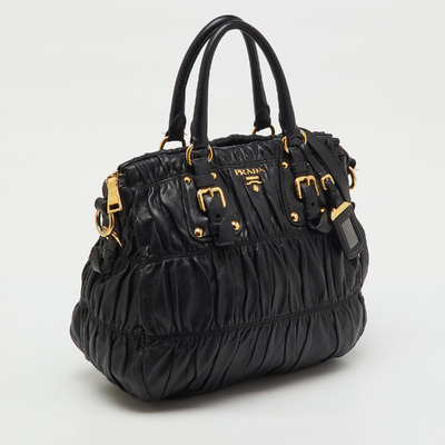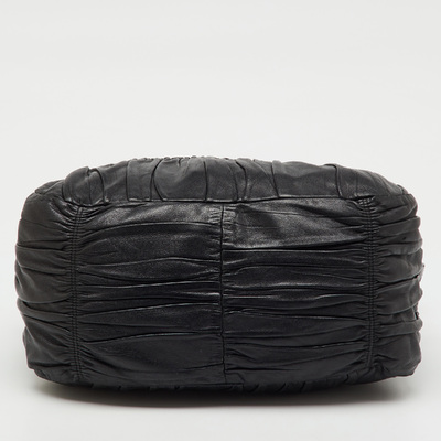 This Prada Gaufre Tote comes in black nappa leather. Ruched textures catch the light, while Italian craftsmanship ensures every stitch, edge, and handle tells a story. Equipped with a versatile strap, it carries authority and unmistakable style.