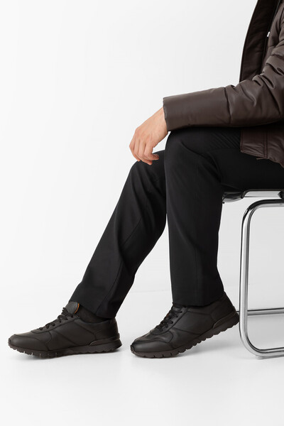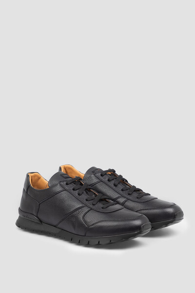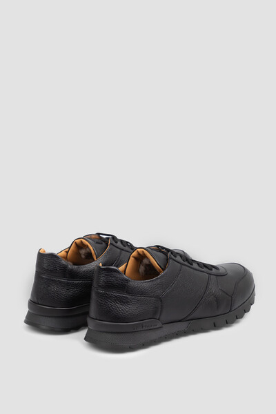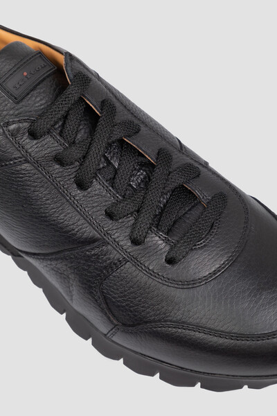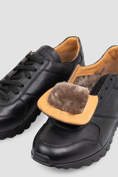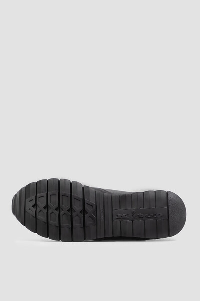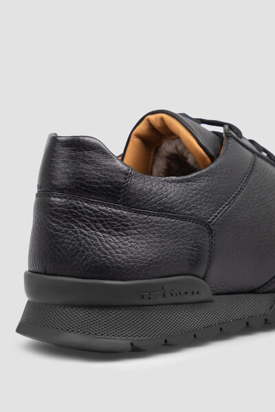 Сникеры чёрного базового цвета от бренда Kiton. Модель изготовлена из мягкой зернистой кожи оленя и дополнена закрытой перекрёстной шнуровкой. На принадлежность удобной пары с укреплёнными округлым носком и задником Дому указывают нашивка с лого на язычке и рельефная надпись-логотип на стабилизаторе пятки. Изделие выделано изнутри густой стриженой овчиной и гладкой телячьей кожей.