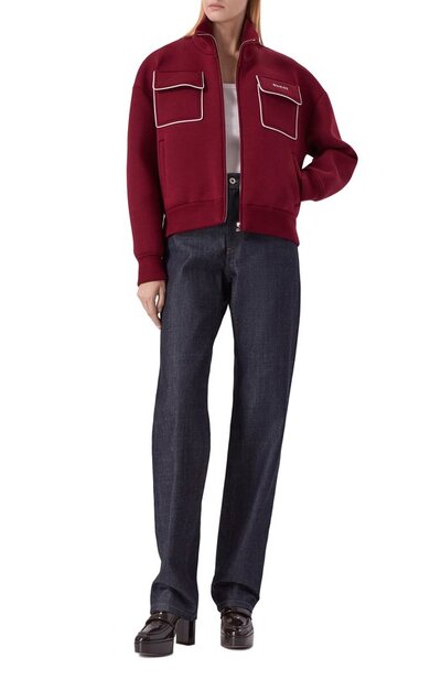 Толстовку с воротником-стойкой и спущенной линией плеч выполнили из вискозного джерси стрейч. Модель дополнили двумя боковыми прорезными и парой нагрудных накладных карманов с окантовкой, украсив один из них логотипом марки.