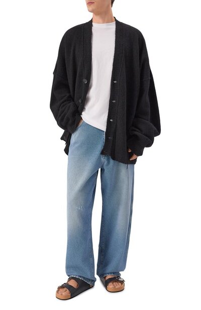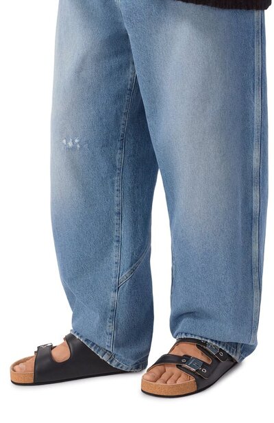 Сандалии из телячьей кожи изготовили в сотрудничестве с маркой Scholl. Модель с тремя ремешками, регулируемыми брендированными металлическими пряжками, поставили на широкую пробковую подошву с резиновым протектором.