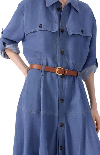 Ремень с пряжкой оттенка античной латуни изготовили из зернистой кожи. О принадлежности аксессуара марке говорит небольшая эмблема VLogo Signature на шлевке.
