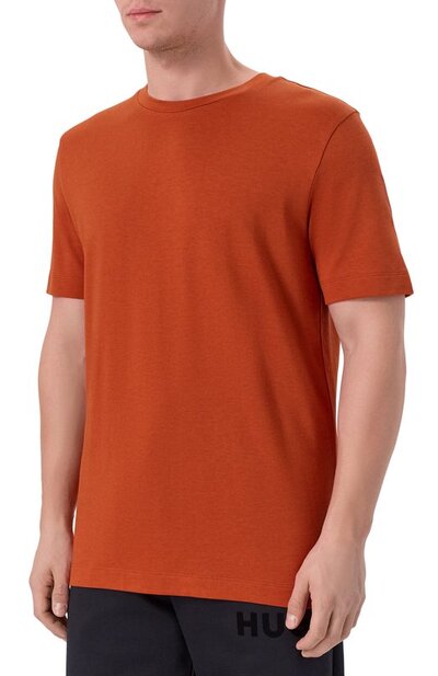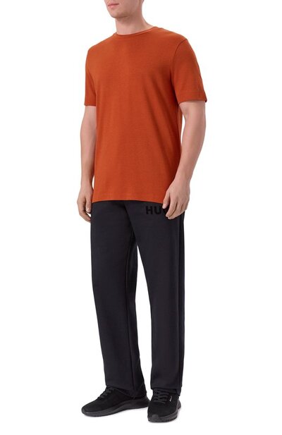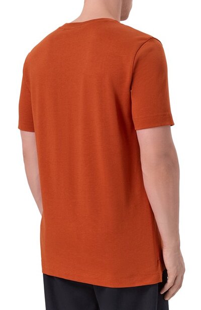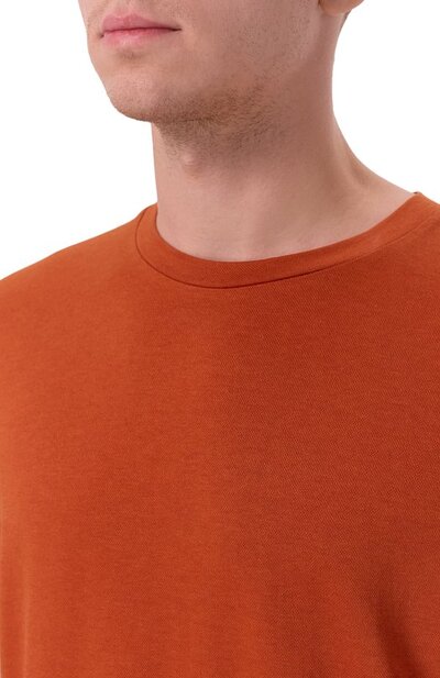 Для пошива базовой футболки H-Thompson с круглой горловиной использовали пике из лиоцелла с добавлением хлопка. По бокам предусмотрели разрезы, над одним из которых – этикетка с логотипом марки.