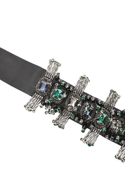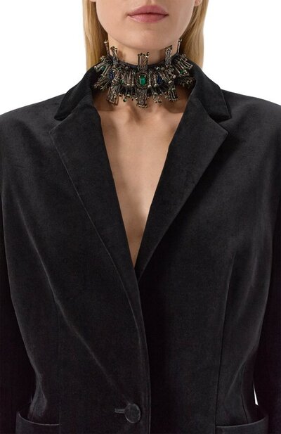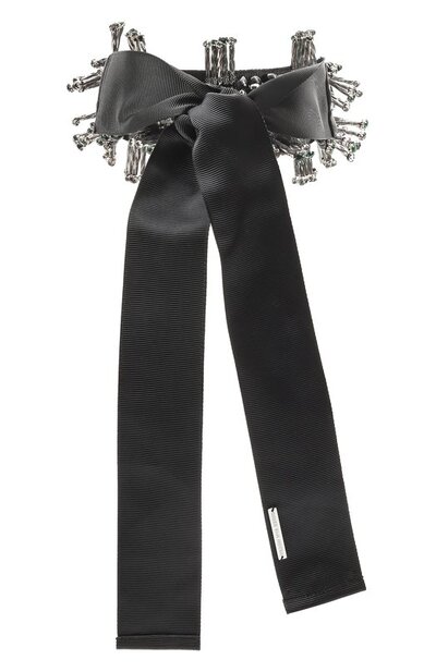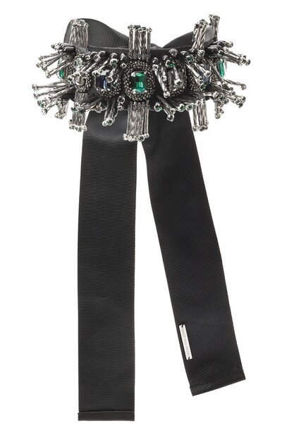 Чокер из полиэстеровой ленты с брендированной металлической деталью завязывается бантом сзади. Аксессуар украсили кристаллами и фигурными бусинами разных форм из смолы.