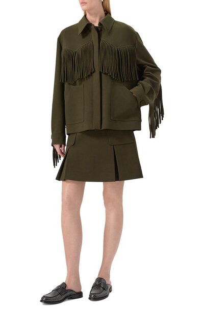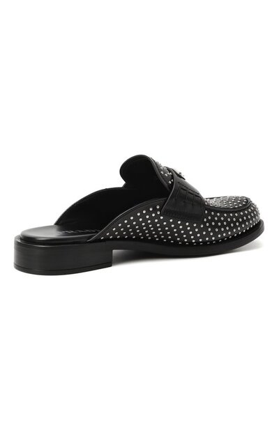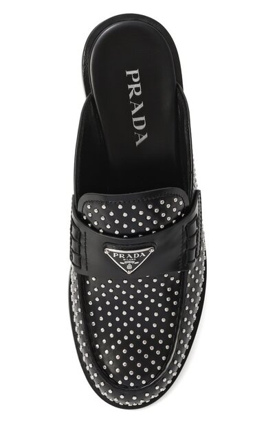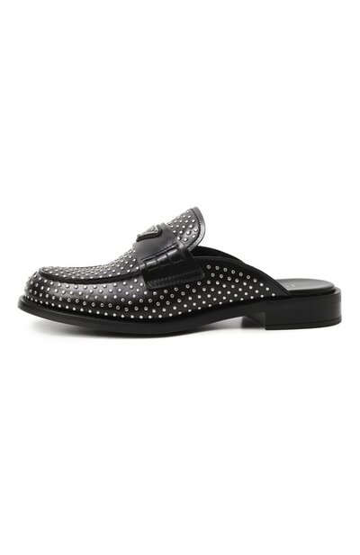 Сабо с металлическими заклепками по всей поверхности украсили перемычкой с фирменным эмалевым треугольником. Модель на наборном каблуке изготовили из гладкой кожи.
