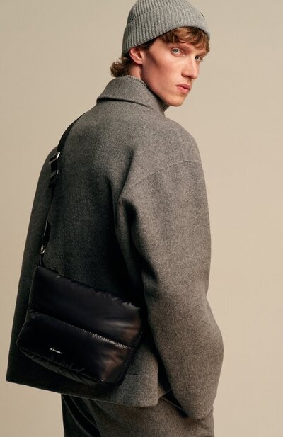 Шапку бини связали резинкой из пряжи на основе кашемира. Широкий отворот украсили нашивкой с тисненым логотипом марки.
