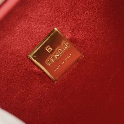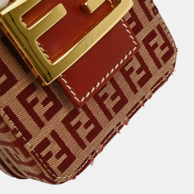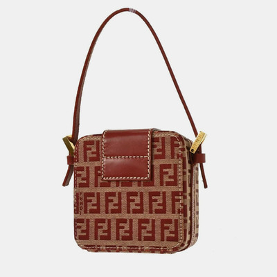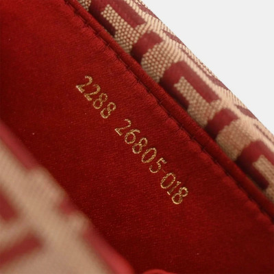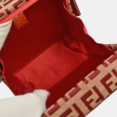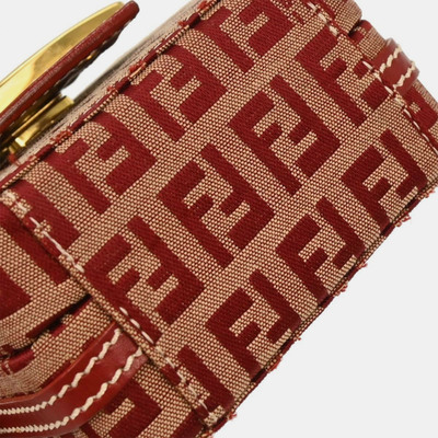 A structured vanity style handbag from Fendi in red Zucchino canvas. Compact yet practical, it features a top handle and zip around closure. Great for short outings or organizing small items.
