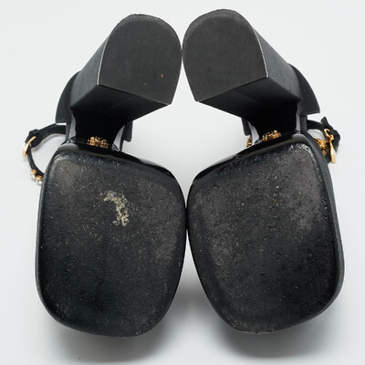 Sleek black satin forms the base of these Versace Aevitas platform pumps, offering height with a comfortable platform. Perfect for evenings out or special occasions, they pair effortlessly with dresses or tailored ensembles.