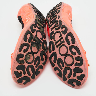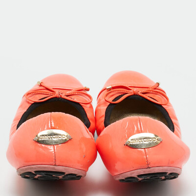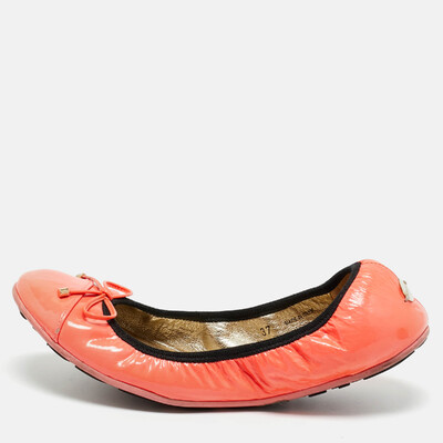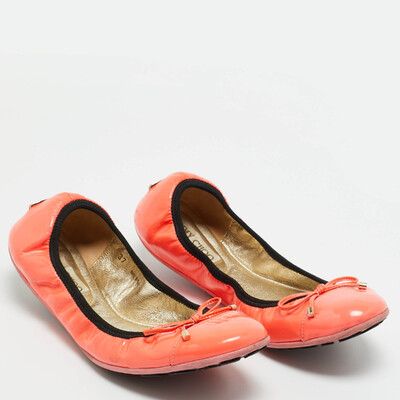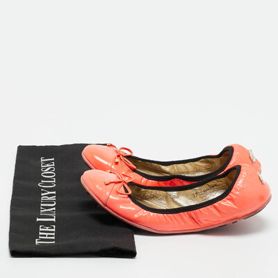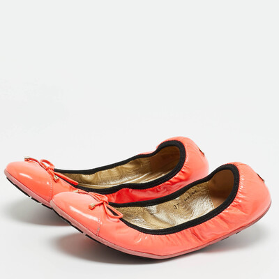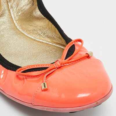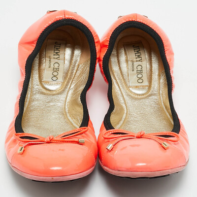 Neon pink patent leather with scrunch detailing brings unexpected energy to a classic ballet flat, ideal for adding a pop of color to everyday dressing.