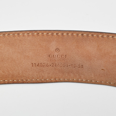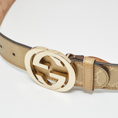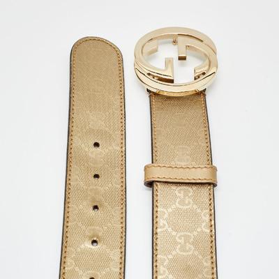 This Gucci belt is rendered in gold GG Imprime canvas with an interlocking G buckle. The shimmering finish transforms a practical accessory into a focal point. Wear it to accent both monochrome looks and bold prints.