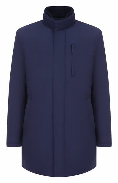 Парку с внутренним и двумя внешними карманами сшили из полушерстяной ткани Loro Piana с обработкой Storm System. Тонкий капюшон спрятан в воротнике-стойке, отделанном изнутри шерстяным трикотажем. Модель с шелковистым стеганым подкладом застегивается молнией, прикрытой штормовым клапаном с кнопками.