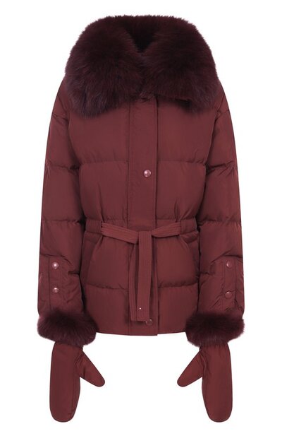 Куртку из полиэстера утеплили утиным пухом и пером. Воротник подчеркнули съемной отделкой из меха полярной лисы, которой вторят манжеты отстегивающихся варежек. По бокам предусмотрели карманы с листочками, а сквозь кулиску на талии продели пояс-ленту. Штормовая планка над молнией, как и разрезы на рукавах, застегивается кнопками.