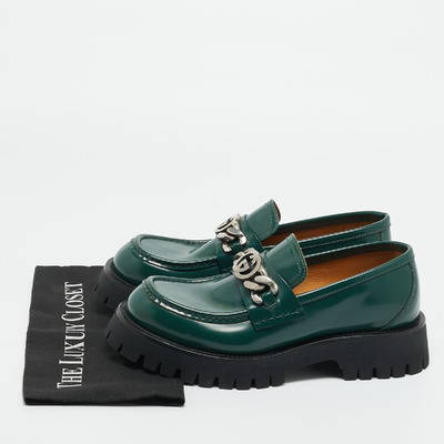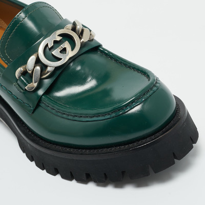 This pair of loafers by Gucci is so comfy, youll love putting them on wherever you go. The pair has been crafted from tan leather and styled with a GG chain on the vamps. Comfy insoles and outsoles smartly complete the loafers.