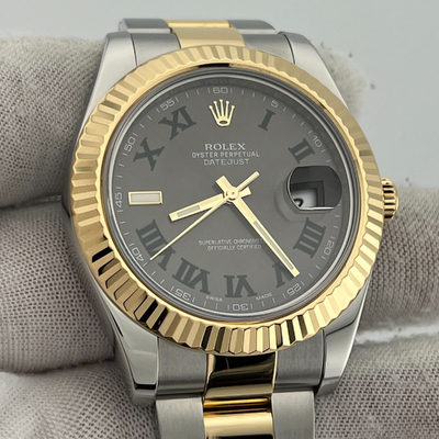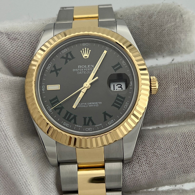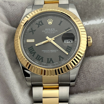 Showcase refined taste with this Rolex Datejust II Slate Wimbledon edition, crafted in 18k yellow gold and stainless steel. Its automatic mechanism delivers flawless performance, while the distinctive dial offers standout style. A luxurious statement for any wrist.