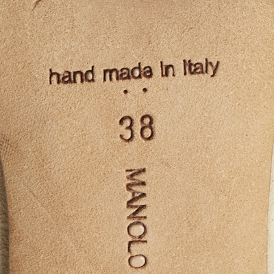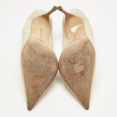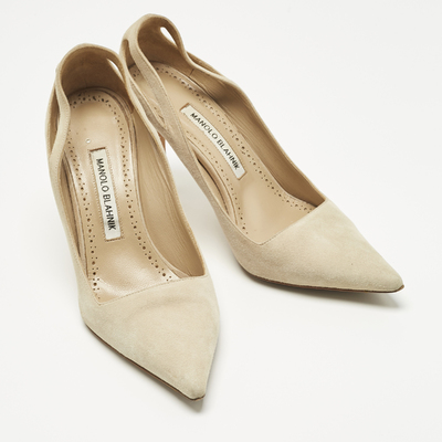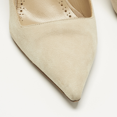 Manolo Blahnik’s pointed toe pumps are crafted in soft grey suede for timeless appeal. The sleek silhouette enhances both skirts and tailored trousers. A wardrobe essential for understated luxury.
