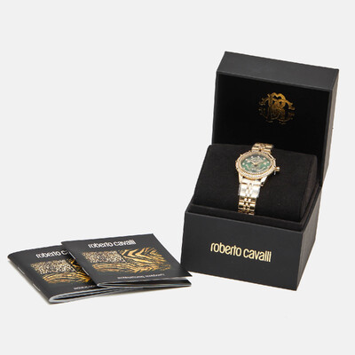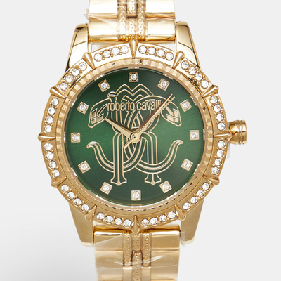 This Roberto Cavalli Classic timepiece combines a rich green dial with a gold plated stainless steel case for a vivid yet refined look. Sleek hour markers and a polished bezel highlight the dial’s colour while a chic bracelet completes the jewellery like profile. Designed to transition seamlessly from workday tailoring to evening wear, it brings the label’s bold Italian style to the wrist.