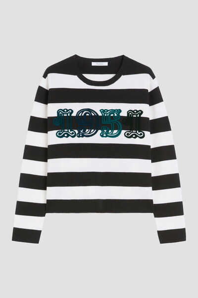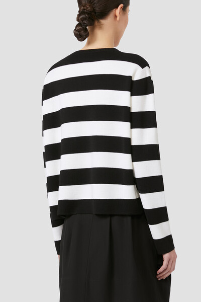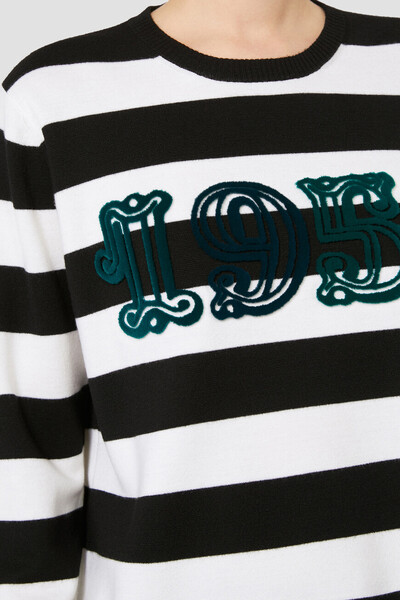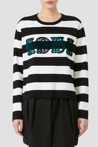 Чёрно-белый свитер миланской вязки от Max Mara. Для изготовления изделия свободного силуэта выбрана тонкая вирджинская шерсть. Поверхность модели с круглым вырезом горловины на резинке декорирована геометрическим мотивом в виде широких горизонтальных полос. Спереди на груди размещён крупный флокированный узор в виде года основания Дома, выполненный в бирюзовом оттенке.