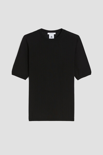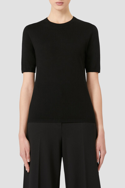 Базовый свитер Max Mara с короткими втачными рукавами. Для создания изделия прилегающего кроя используется тонкая вирджинская шерсть. Характерной особенностью модели чёрного цвета является вязка лицевой гладью. Свитер станет идеальным дополнением сезонного гардероба.
