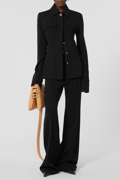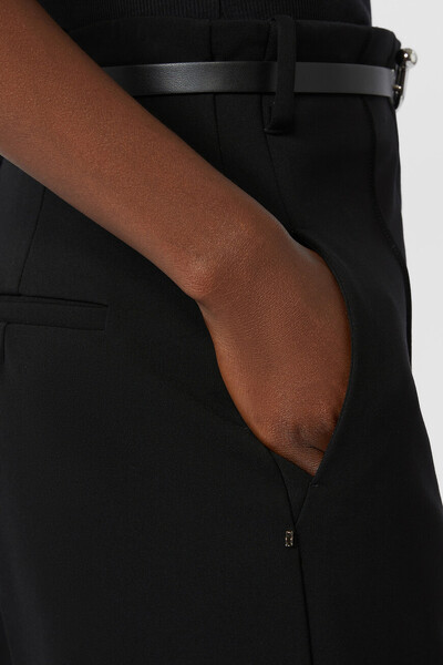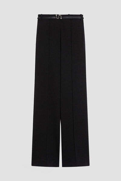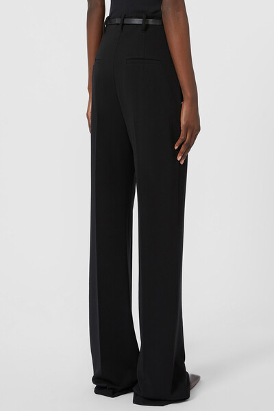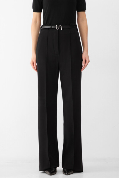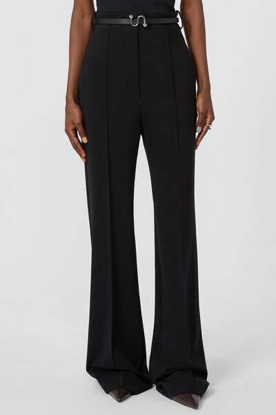 Расклешенные книзу брюки Max Mara из эластичной креповой ткани. Для создания модели с высокой линией талии выбраны прочный нейлон и вискозное волокно чёрного базового цвета. Линию талии подчёркивает тонкий пояс с металлической S-образной пряжкой, делающей отсылку к символике популярной линейки Sportmax. Носите изделие в комплекте с парным жакетом с отложным воротником из той же коллекции.