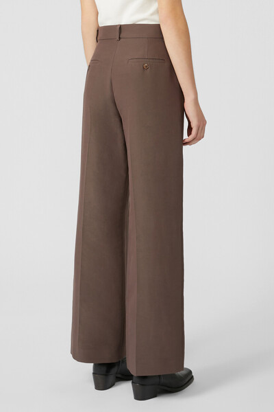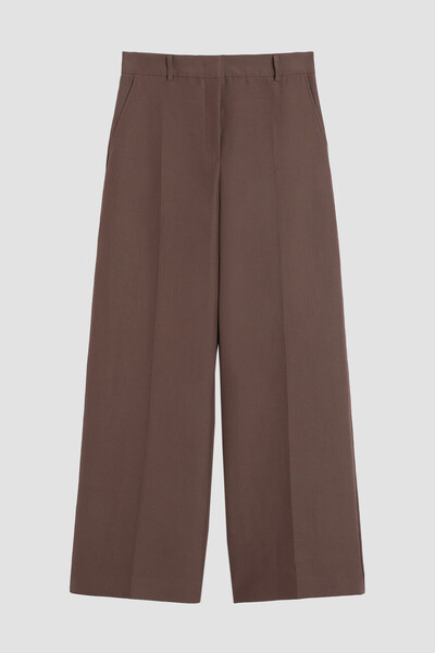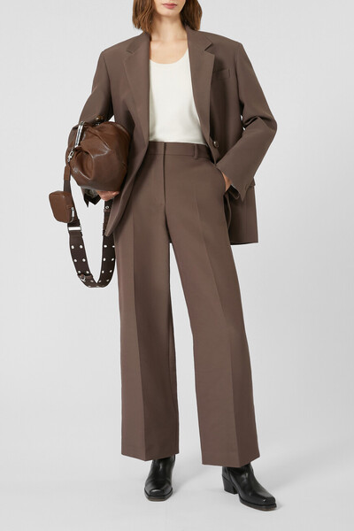 Брюки-палаццо шоколадного оттенка из линейки Max Mara Weekend. Широкая модель выполнена из мягкого трикотажа на основе хлопка и ацетата в мужском стиле. Особенностями изделия являются высокая линия талии и наличие заутюженных складок на брючинах. Брюки составят органичный комплект с парным блейзером оверсайз из той же линейки.