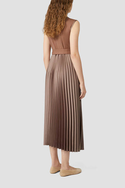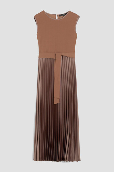 Платье Max Mara в глубоком коричневом оттенке. В изделии без рукавов филигранное соединились минимализм и элегантность. Модель сшита из мягкого трикотажа, что обеспечивает комфорт и свободу движений. Расклешённая плиссированная юбка из струящегося материала и пояс в комплекте подчеркнут линию талии. Носите платье соло или сочетайте с жакетами и кардиганами, создавая многослойные комбинации.