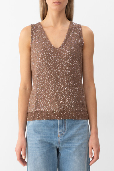 Вязаный топ Max Mara с декором из переливающихся на солнце пайеток. Для изготовления модели без рукавов используется пряжа на основе хлопка, прочного полиэфира и нейлона коричневого оттенка. Оптимальную посадку изделия с глубоким V-образным вырезом горловины по фигуре обеспечивает широкий эластичный пояс.