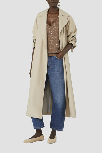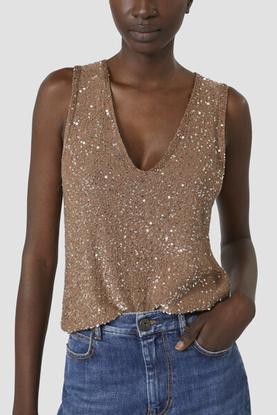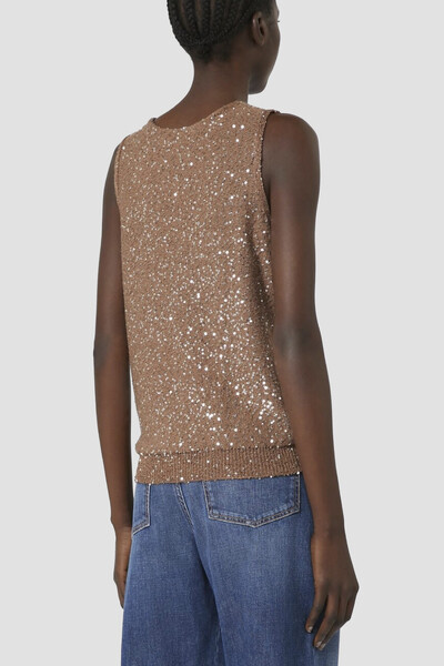 Вязаный топ Max Mara с декором из переливающихся на солнце пайеток. Для изготовления модели без рукавов используется пряжа на основе хлопка, прочного полиэфира и нейлона бежевого оттенка. Оптимальную посадку изделия с глубоким V-образным вырезом горловины по фигуре обеспечивает широкий эластичный пояс.