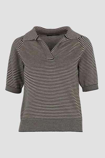 Поло с изящным V-образным вырезом горловины от Max Mara. Модель прямого силуэта изготовлена из тонкого хлопкового трикотажа с геометрическим мотивом в виде тонких горизонтальных полос чёрного и светло-бежевого оттенков. Изделие с короткими рукавами станет основой повседневных сезонных комплектов.