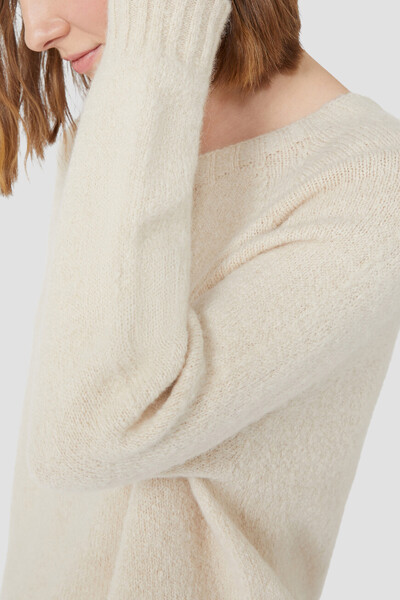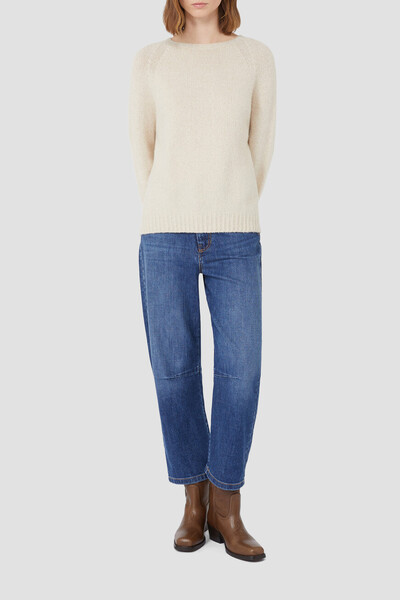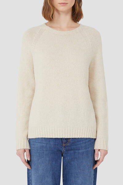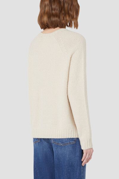 Расслабленный свитер Max Mara в оттенке айвори. Базовая модель связана из эластичной пряжи на основе шерсти альпаки, хлопка, прочного нейлона и модала. Фасон изделия средней длины характеризуется наличием длинных рукавов реглан и широкого эластичного пояса и манжет-резинок для оптимальной посадки по фигуре.