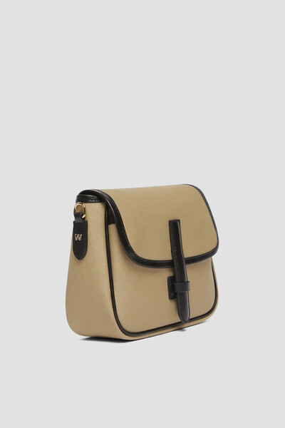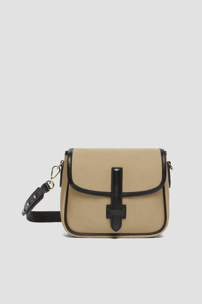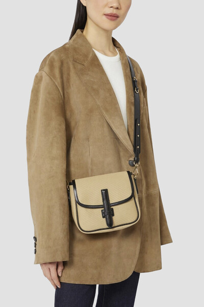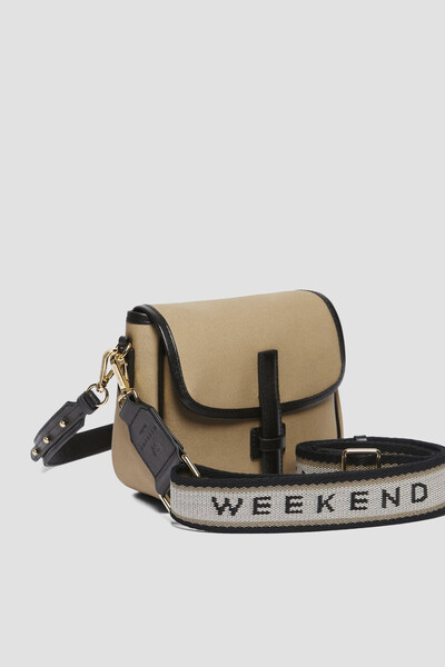 Сумка небольшого формата из линейки Max Mara Weekend. Для производства изделия бежевого оттенка выбран фактурный хлопковый трикотаж. Края изделия и детали изготовлены из прочной телячьей кожи. Во внутренней части аксессуара расположены одно широкое отделение, плоское отделение спереди и боковой карман на клёпке с брендированием. Модель с откидным клапаном на кожаном ремешке с тренчиком для фиксации идеально подходит для повседневных нужд.