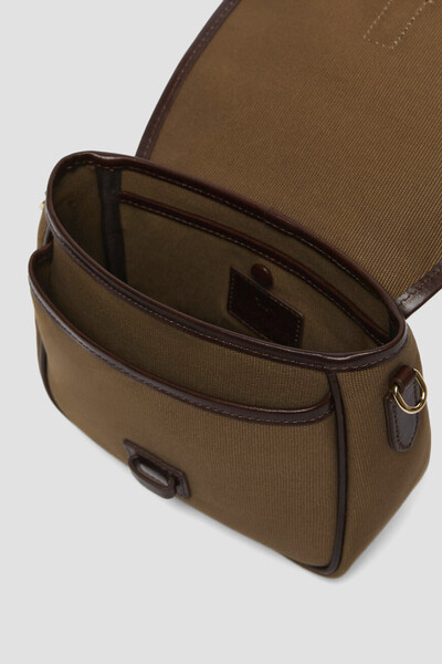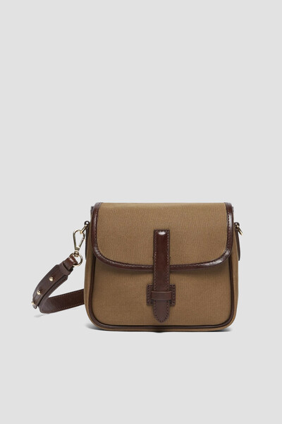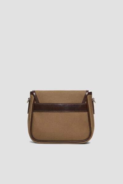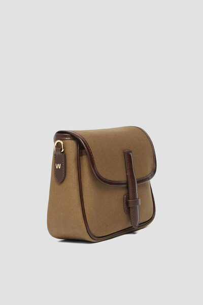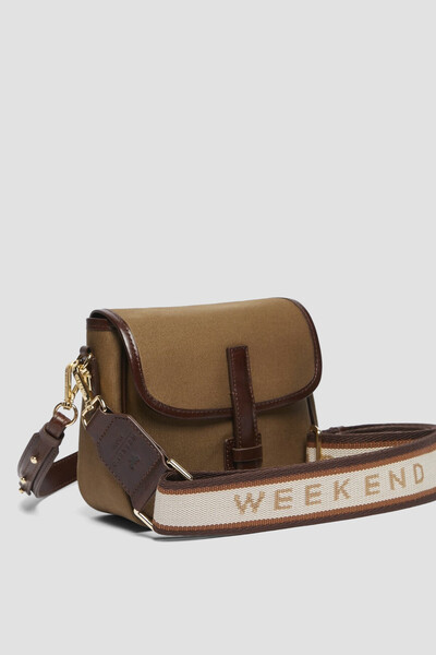Сумка Max Mara с откидным клапаном на кожаном ремешке с тренчиком для фиксации. Для изготовления модели небольшого формата выбран фактурный хлопковый трикотаж бронзового оттенка. Отличительными деталями являются отделка аксессуара и кант из прочной телячьей кожи тёмно-коричневого цвета, а также два съёмных регулируемых ремня, один из которых кожаный, а другой широкий с крупной надписью-названием линейки Weekend.