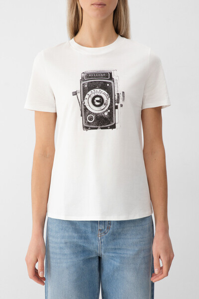 Футболка Max Mara с винтажным принтом. Контрастное изображение ретро-камеры с надписью WEEKEND отсылает к эстетике старой фотографии и подчёркивает индивидуальность бренда. Модель прямого кроя с короткими рукавами и круглым вырезом горловины делает футболку универсальной для городских и casual-образов.