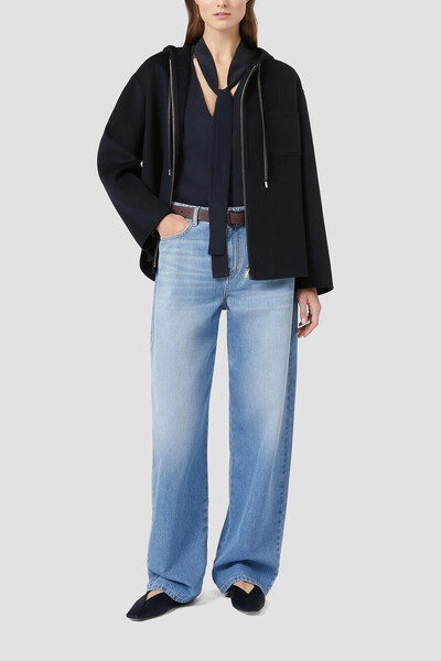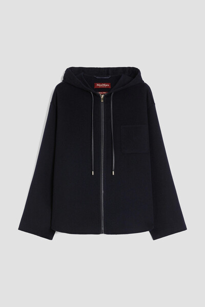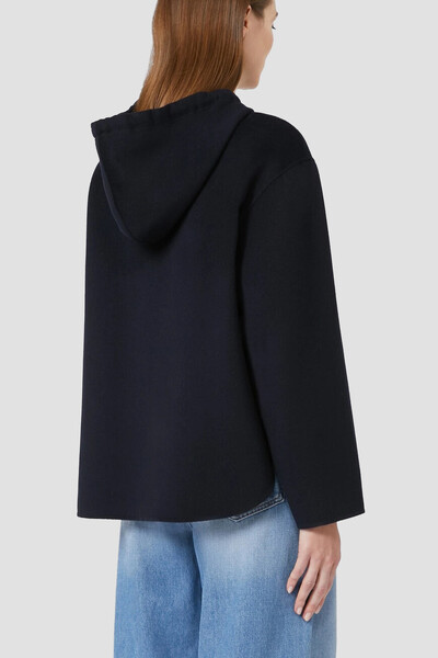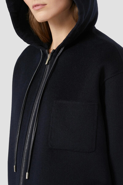 Полупальто Max Mara с глубоким капюшоном. Модель выполнена из качественного материала на основе верблюжьей шерсти, кашемира и шёлка. Капюшон со шнурками обеспечивает дополнительную защиту от ветра и холода, а полукруглый подол добавляет лёгкую асимметрию и современный акцент в дизайн. Планка, скрывающая молнию, и шнурки выполнены из гладкой кожи наппа в тон.
