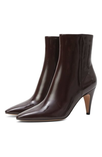 Ботильоны Amelia с зауженным мысом выполнили из наппы Nuit с лаковым покрытием. Пара на высоком каблуке застегивается боковой молнией с золотистым брендированным пуллером.